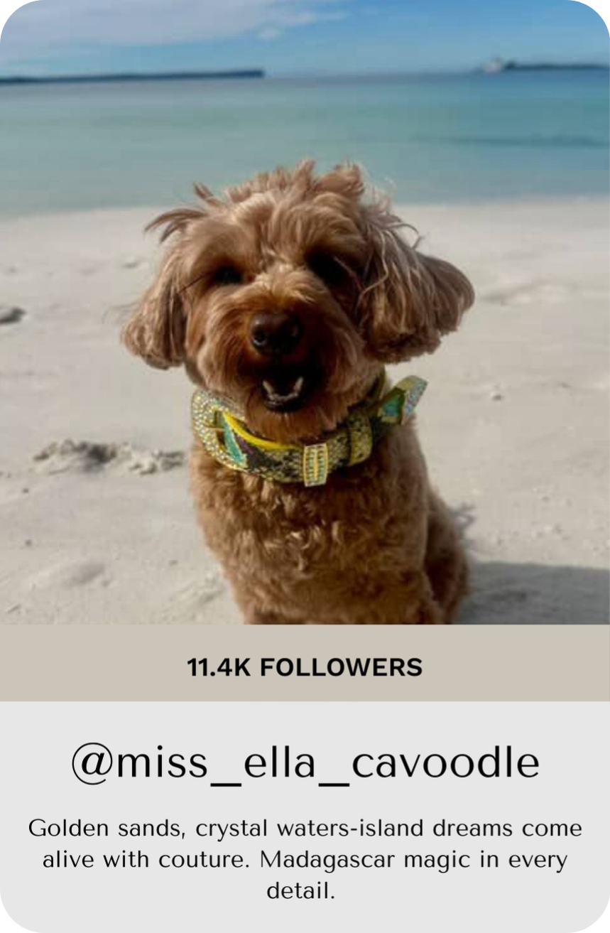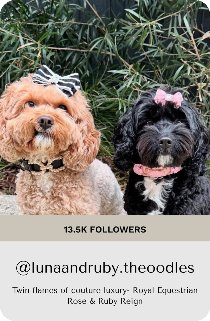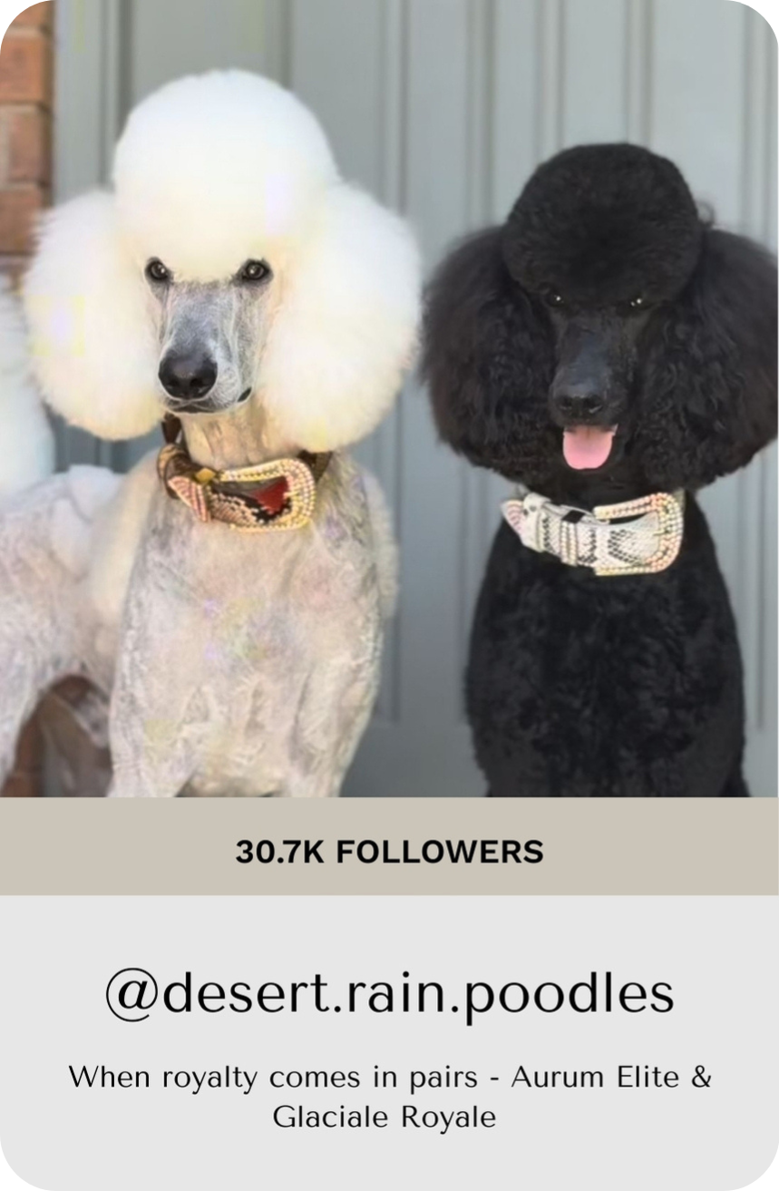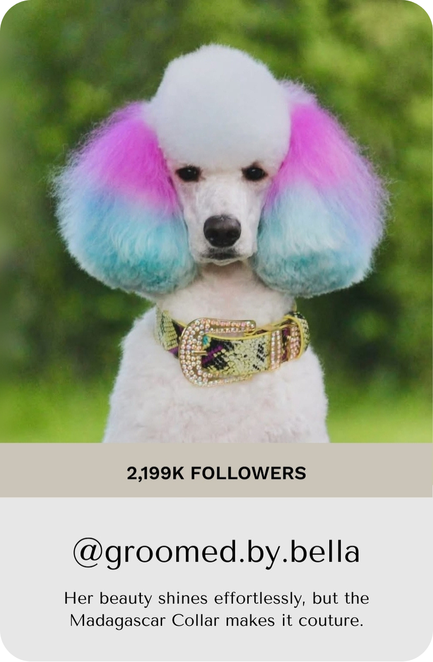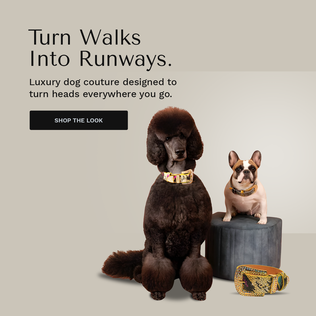 What began as a passion became a promise. To design accessories that are unapologetically glamorous, beautifully crafted, and worthy of the dogs who mean everything to us. Every piece is made to celebrate the bond between people and their pets. Our collars are couture statements — handcrafted from the finest leather, set with crystals, and designed to shine with elegance and emotion.